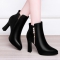 高跟女鞋2020秋冬新款尖头粗跟女靴加绒保暖棉皮鞋侧拉链短靴防水台增高大红色结婚鞋子女